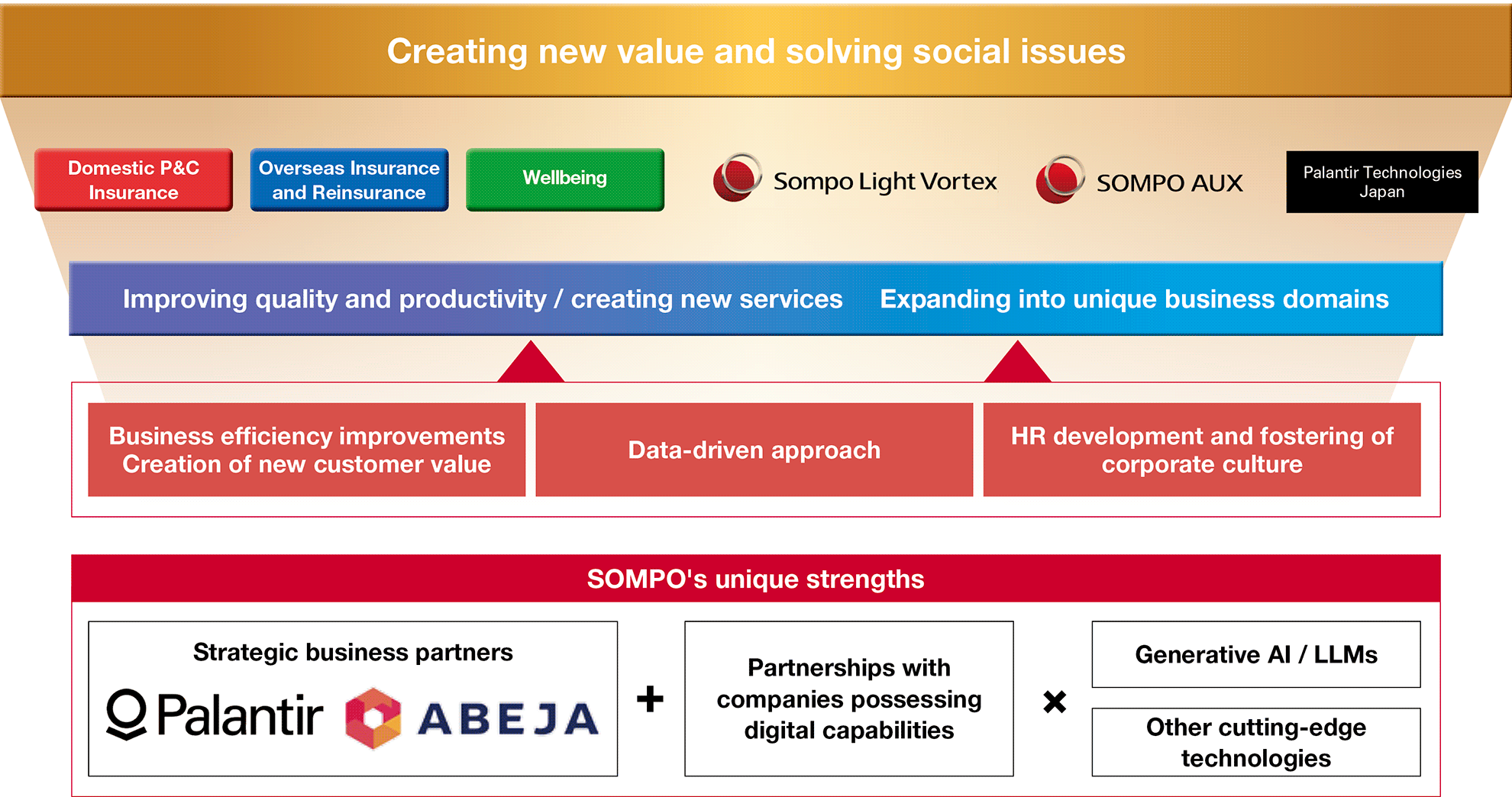 In the Mid-Term Management Plan that commenced in FY2024, we will harness our data and digital expertise and HR capabilities to further accelerate business efficiency and earnings improvements in our existing businesses in order to realize the SOMPO's Purpose - For a future of health, wellbeing and financial protection. We will also waste no time in deploying the technologies across the Group that can have a tremendous impact on business, such as AI and LLMs. By providing training to employees on how to apply these technologies and establishing the necessary infrastructure, we will aim to create an environment where humans and AI can coexist so that work tasks can be streamlined and business outcomes maximized.